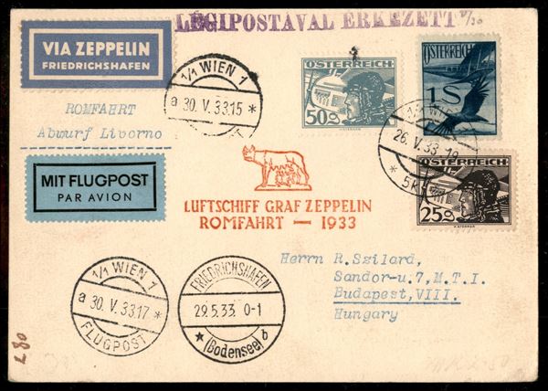 Volo in Italia/Romfahrt - Volo di andata (29 maggio 1933) - lancio su Livorno (Longhi 203 - Michel 302 Ia) cartolina da Vienna del 26.5.33 per Budapest con affrancatura di Austria
