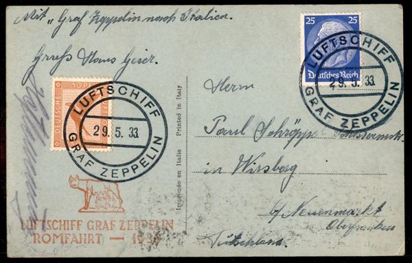 Volo in Italia/Romfahrt - Volo di andata 29 maggio 1933 (Longhi 216 - Michel 302) cartolina dalla Germania timbrata a bordo e spedita dal timoniere Geier (firmata) e autografata dall'ufficiale di guardia Wittermann - molto raro