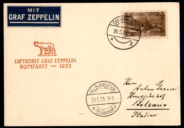 Volo in Italia/Romfahrt - Volo di andata 29 maggio 1933 - posta da paesi esteri (Longhi 227 - Michel 302) cartolina dal Sarre