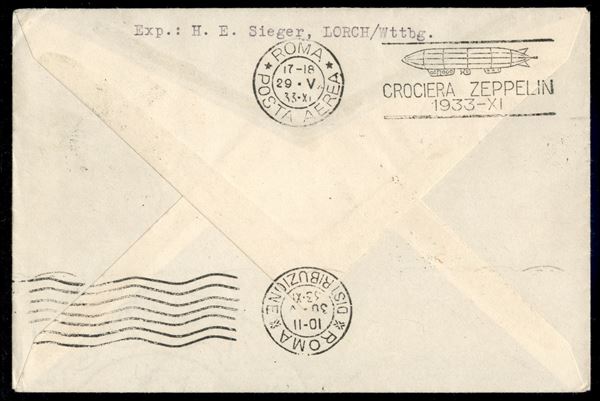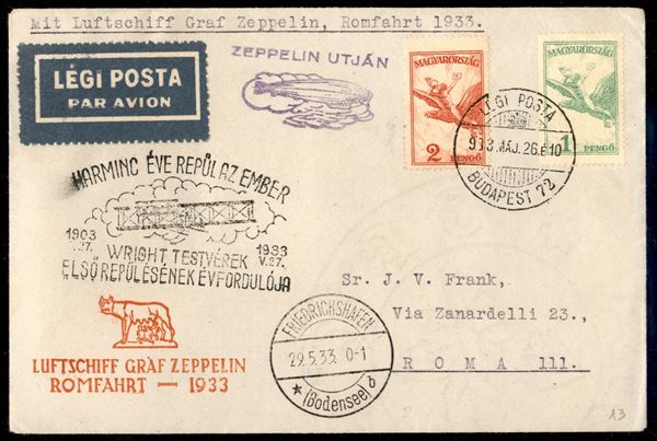 Volo in Italia/Romfahrt - Volo di andata 29 maggio 1933 - posta da paesi esteri (Longhi 229 - Michel 302) busta dall'Ungheria - due timbri Zeppelin ungheresi "Zeppelin Utjan" + "Harminc Eve Repulaz Ember" - raro