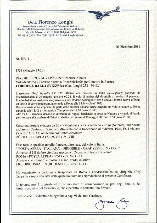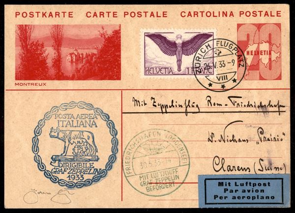 Volo in Italia/Romfahrt - volo di ritorno (29/30 maggio 1933) - spediti via Roma da altri paesi (Longhi 258 - Michel 304Aa) cartolina postale dalla Svizzera - riprodotta a pag. 91 del catalogo Longhi - cert. Longhi