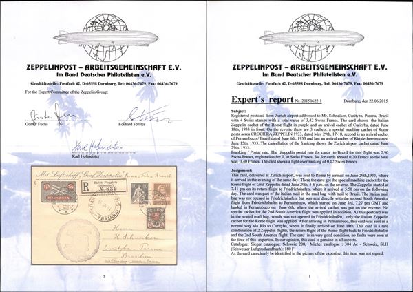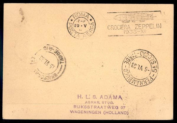 Volo in Italia/Romfahrt - volo di ritorno (29/30 maggio 1933) - posta in transito per l'inoltro in Sud America (Longhi 274 - Michel 304Ac) cartolina dalla Svizzera - raro - cert. Fuchs