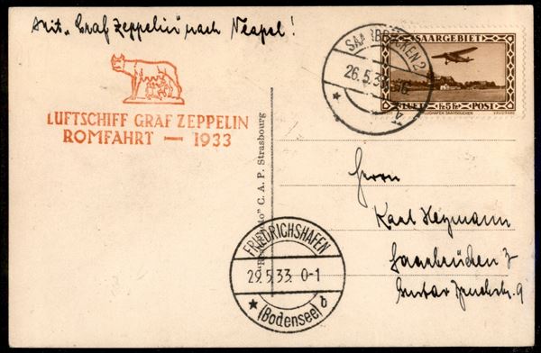 Volo in Italia/Romfahrt - volo di ritorno (29 maggio 1933) - lancio su Nettuno (Longhi 253 - Michel 304 I) cartolina da Saarbrucken del 26.5.33
