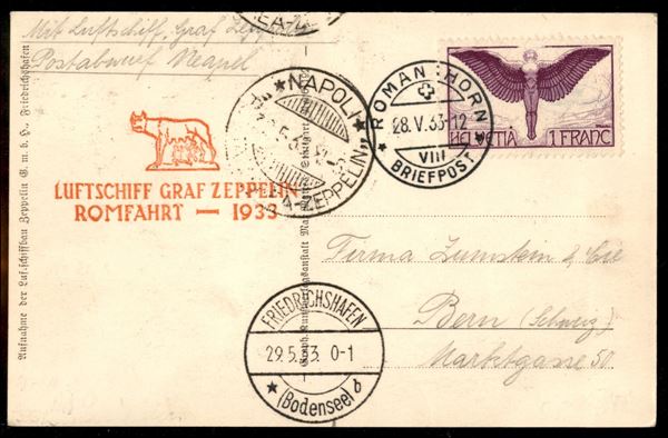 Volo in Italia/Romfahrt - volo di ritorno (29 maggio 1933) - lancio su Nettuno (Longhi 254 - Michel 304 I) cartolina dalla Svizzera con timbro di arrivo di Napoli