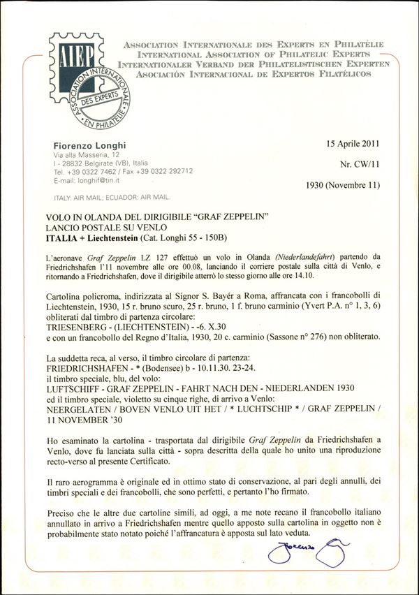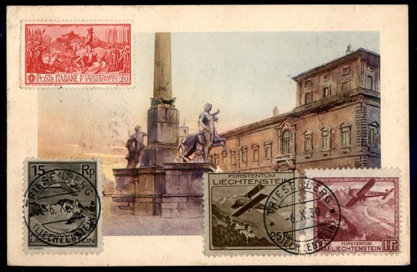 Volo in Olanda/Fahrt Nach Den Niederlanden - 11 novembre 1930 - lancio postale su Venlo (Longhi 55 - Michel 150 l) cartolina da Triesenberg del 6.10.30 per Roma con affrancatura mista Italia Liechtenstein - 3 aerogrammi volati - molto raro - cert. Longhi