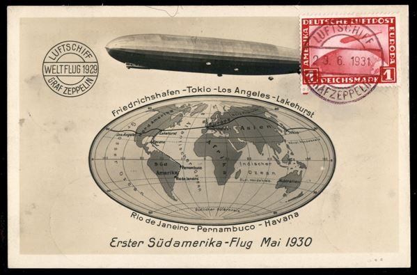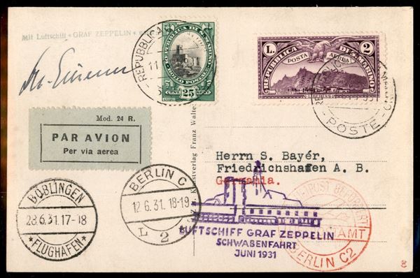 Volo in Svevia/Schwabenfahrt - 28 giugno 1931 (Longhi 68 - Michel 191) cartolina da San Marino del 11.6.31 per Friedrichshafen con affrancatura combinata San Marino Germania per doppia spedizione - firma autografa del Capitano Eckner - 2 cartoline volate di cui solo una con autografo - rarissimo