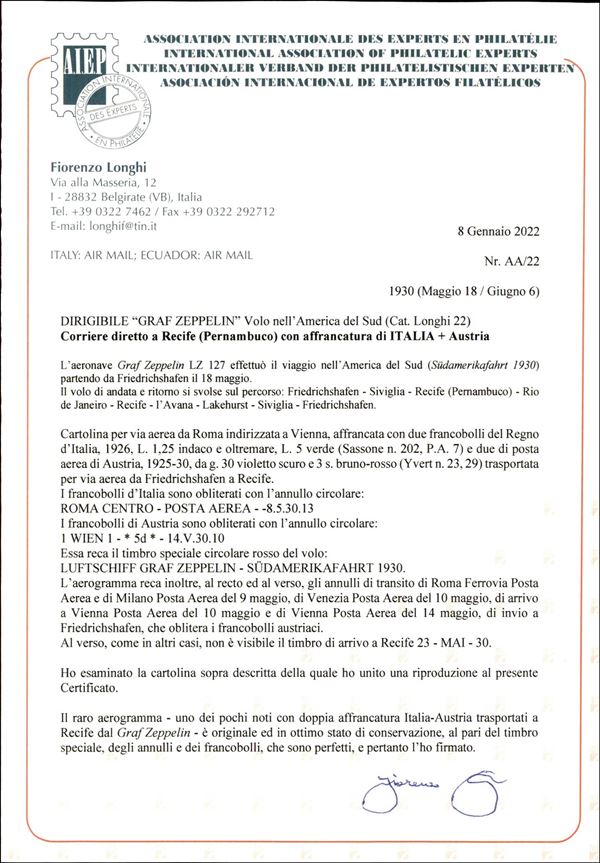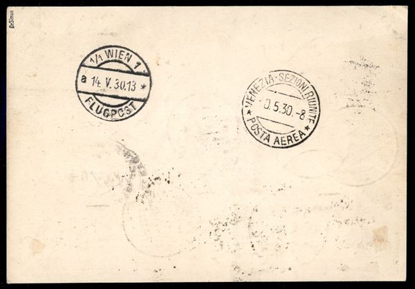 Volo nell'America del Sud/Sudamerikafahrt - 20/22 maggio 1930 (Longhi 22 - Michel 63) cartolina da Roma del 9.5.30 per Vienna con affrancatura mista Italia Austria - pochissime cartoline conosciute - molto raro - cert. Longhi