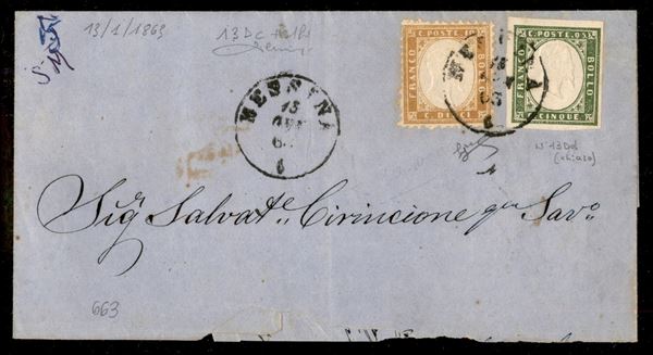 10 cent (1) + 5 cent Sardegna verde bronzo (13Dd) su fronte di lettera da Messina del 13.1.63 - Biondi