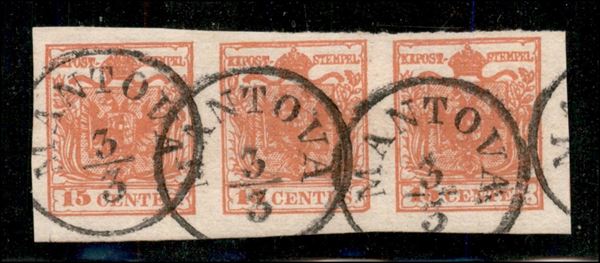 1852 - Striscia di tre del 15 cent (6) - III tipo - Mantova 3.3. - molto bella e fresca
