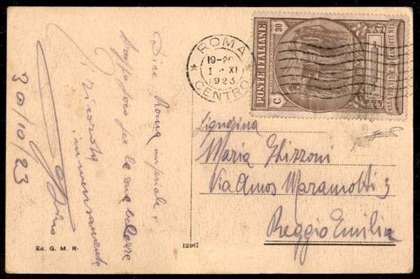 30 cent bruno chiaro Camice Nere isolato su cartolina da Roma 1.XI.1923 per Reggio Emilia - uso non filatelico - Ferrario