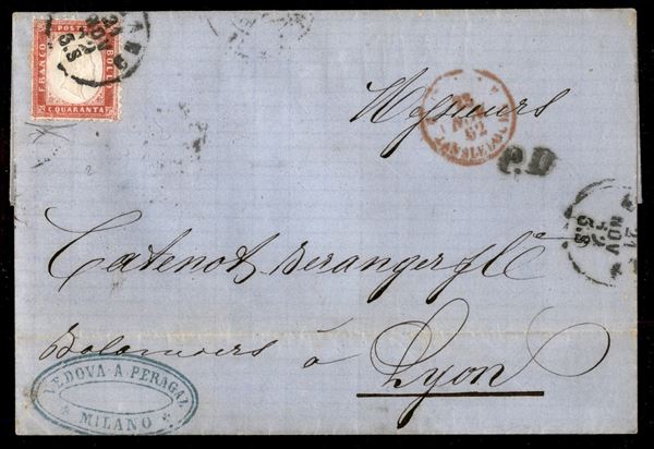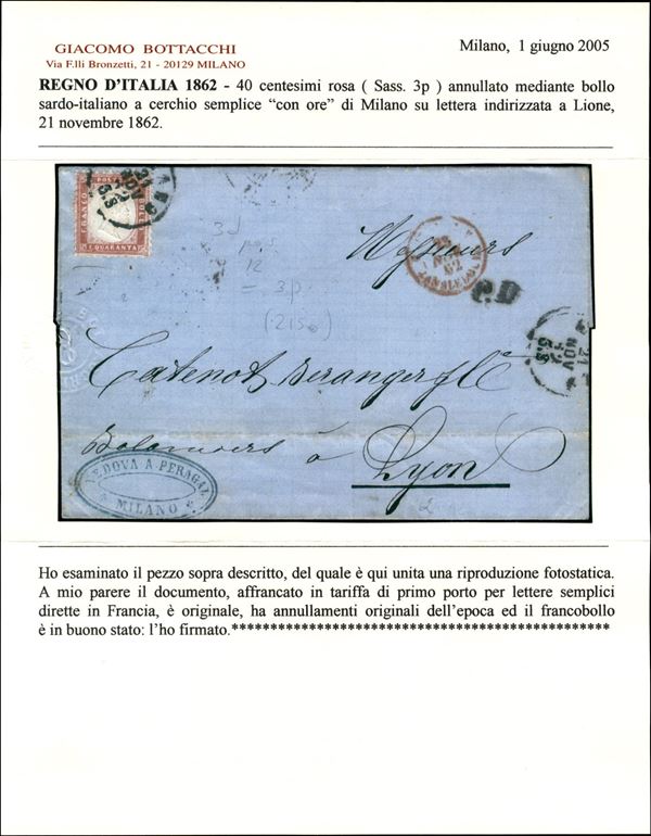40 cent rosa (3p) con filetto di riquadro esterno - lettera da Milano a Lione del 21.11.62 - cert. Bottacchi