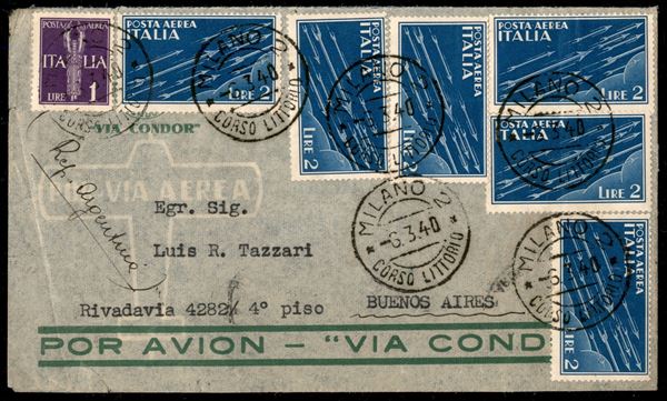 Aerogramma per l'Argentina affrancato con Aerea Miti e Simboli 1 lira violetto + due coppie + due singoli 2 lire azzurro (A14/15) da Milano 2 Corso Littorio 3.3.40 via New York a Buenos Aires - ex coll. Provera