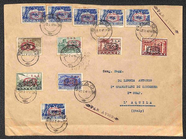 Amministrazione Militare Greca Dodecaneso - Bustone affrancata con i valori della serie soprastampati (sei 1+2/7) da Rodi a l'Aquila del 22.10.47 - molto0 bella e rara