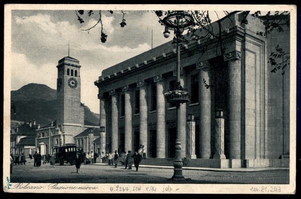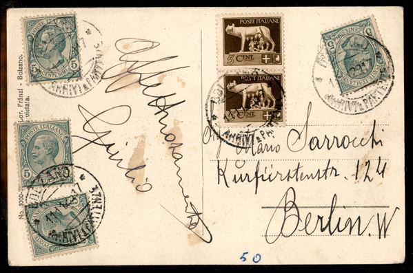 Cartolina paesaggistica affrancata con valori gemelli da 5 cent Leoni (quattro) + coppia Imperiale (81 + 243) da Bolzano 11.11.29 per Berlino - ex coll. Provera