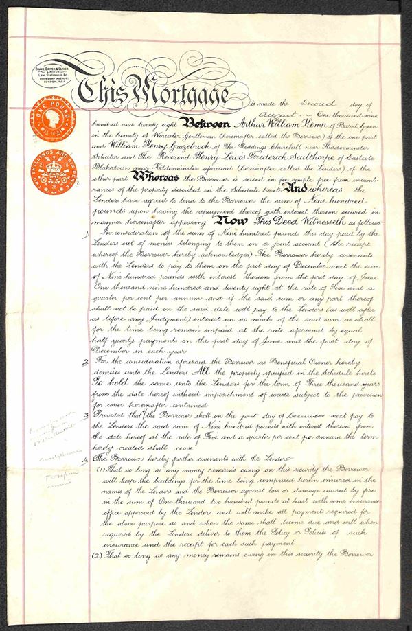Contratto ipotecario su fogli protocollo in lingua inglese per la cessione di terreni e abitazioni del 2.8.28