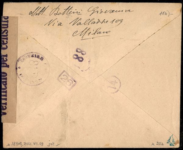 Lettera da Milano 27.XII.44 per Genova non affrancata e tassata in arrivo con coppia 1 lira violetto Imperiale annullata in rosso con bollo Genova Corrispondenze (Tassate) - data illeggibile - fascette e bolli di censura