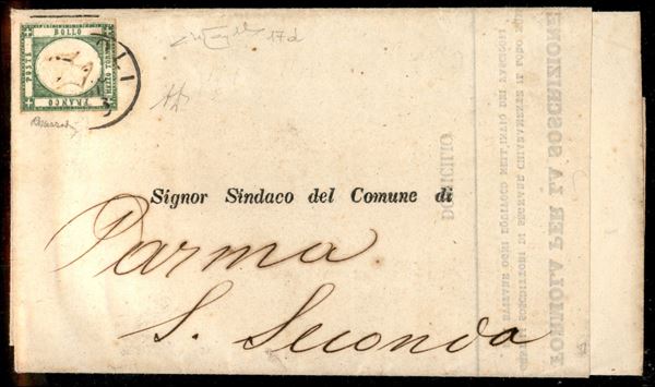 Mezzo tornese verde smeraldo (17d) isolato su circolare da Napoli a S. Secondo del 24.12.61 - ritagliato rasente il disegno (perfetto) - Diena + cert. Raybaudi (6.000)