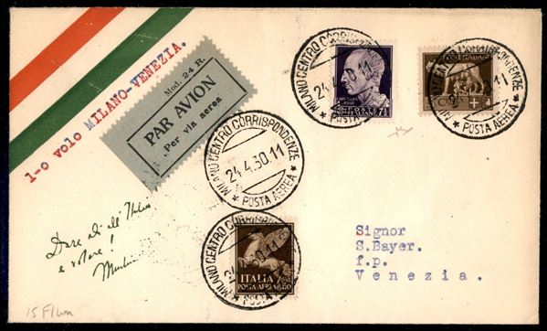 Milano Venezia 24.4.30 (Longhi 2143) - aerogramma del volo speciale - 15 volati - raro - Chiavarello