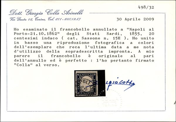 Napoli al Porto 21.10.62 - 20 cent indaco (Sardegna 15E) - ultima data nota di tale impronta - cert. Colla