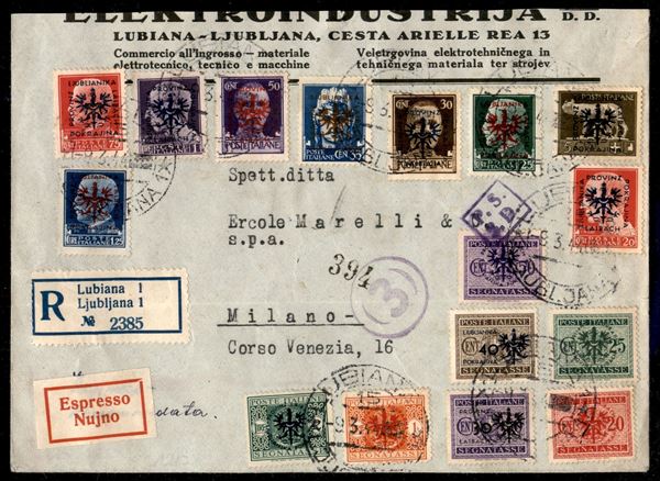 Raccomandata espresso con affrancatura di 8 valori di posta ordinaria (1+4/11) pił 7 valori segnatasse (3/9) da Lubiana a Milano del 9.3.44
