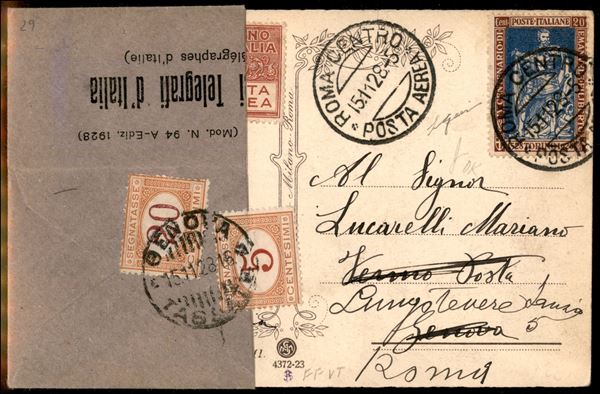 Roma Genova 15.11.28 (Longhi 1876) - cartolina del primo volo tassata in arrivo per giacenza - circa 30 aerogrammi - molto bella - Gazzi
