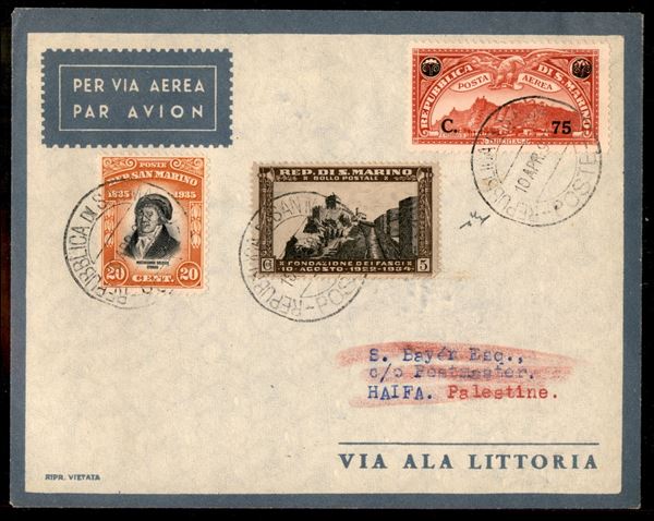 San Marino Haifa 10.4.37 (Longhi 3663) - aerogramma del primo volo - 25 volati - Chiavarello