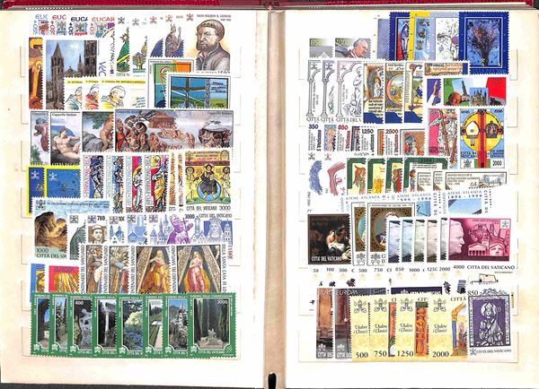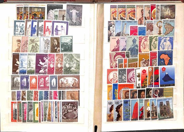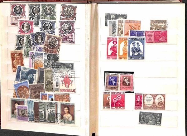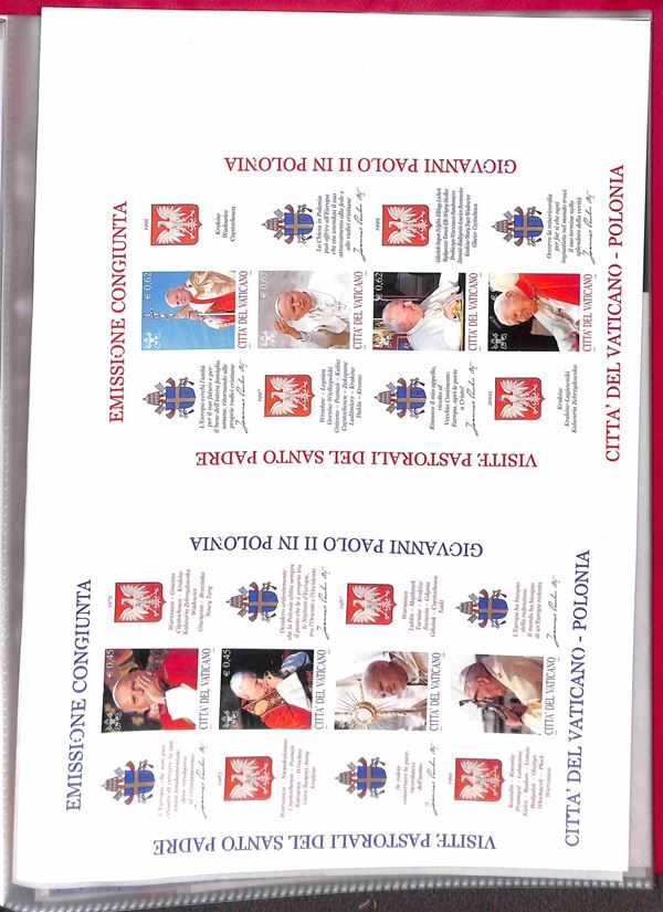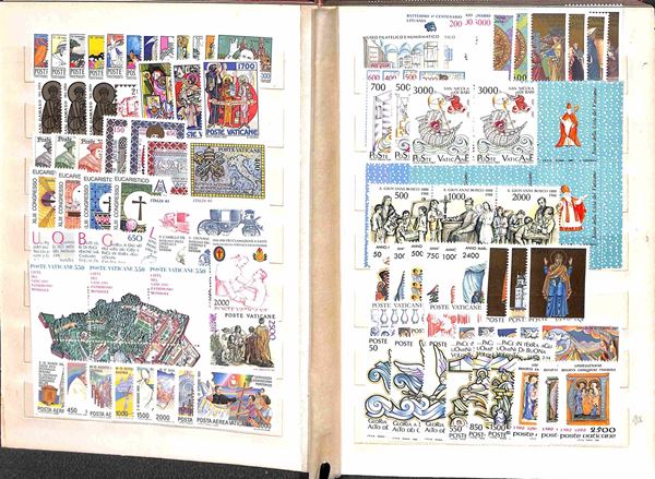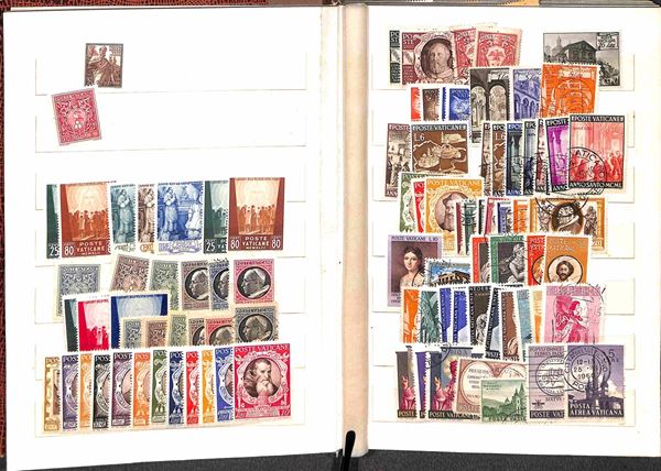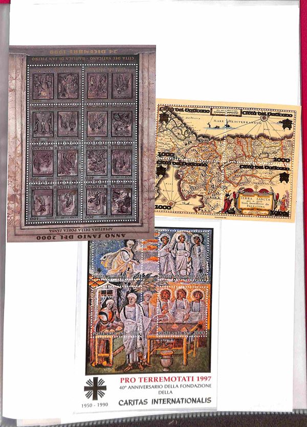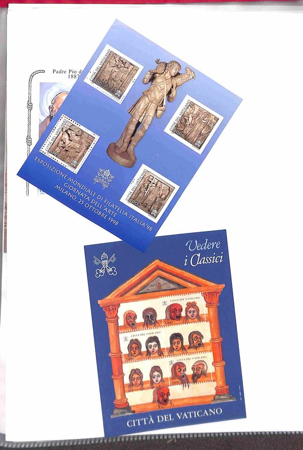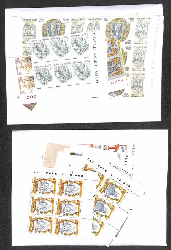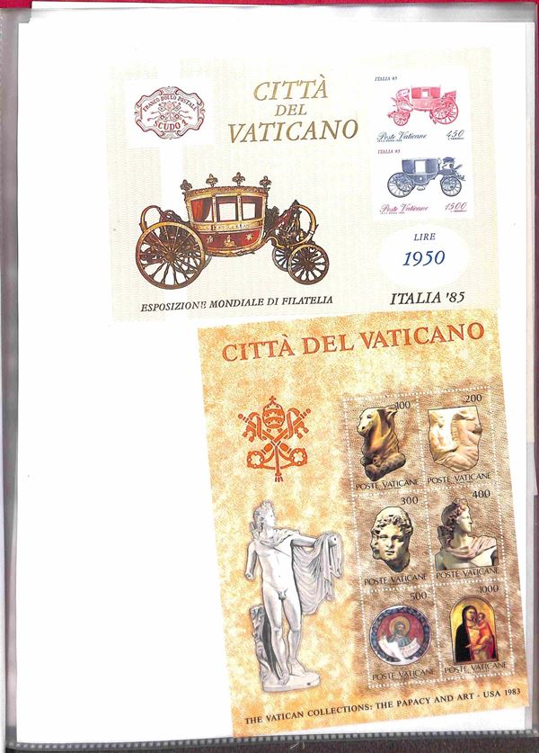 VATICANO - 1929/2007 - Collezione di valori serie complete foglietti minifogli e libretti del periodo montati in due piccoli raccoglitori + album portafogli + 37 buste con valori sciolti in coppie quartine blocchi e singoli divisi per anno d'emissione - i valori del primo periodo principalmente usati ed incompleti dal 1953 in poi gomma integra - ottimo insieme