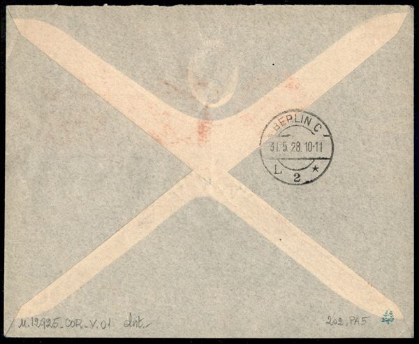 Venezia Berlino 30.5.28 (Longhi 1845) - aerogramma affrancato con Floreale 1,25 lire + Aerea 1,20 lire annullati con guller rosso Venezia Posta Aerea