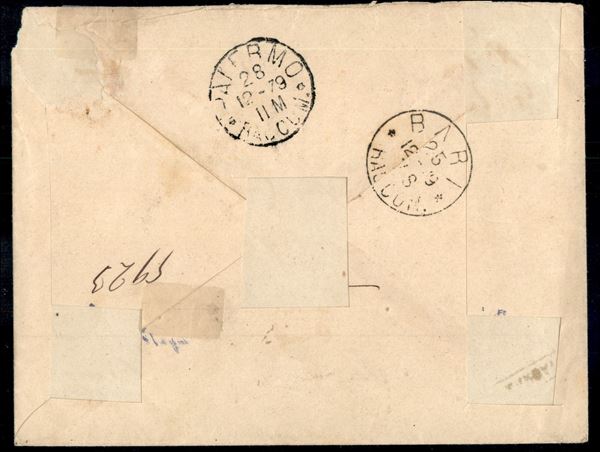 10 cent Vitt. Em. II + tre 20 cent Umberto I (27 + 39) su raccomandata due porti da Grumo Appula per Palermo del 25 dic. 79