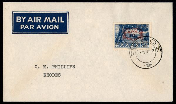 10 dracme su 2000 (1) usato su busta a Rodi nel giorno d'emissione 1.4.47