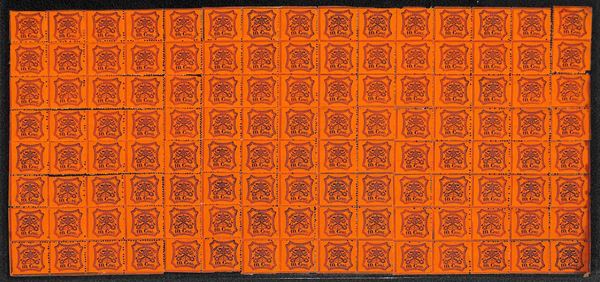 1869 - Foglio di 120 esemplari del 10 cent arancio vermiglio (26) - 3 esemplari staccati - gomma integra con qualche punto d'ingiallimento sulla dentellatura - Diena