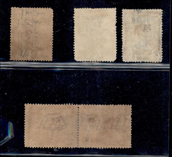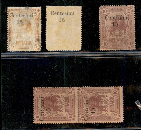 1905 - Insieme di 4 valori dell'emissione con soprastampa in moneta italiana - due 15 cent su 5 anna (8) pił coppia e singolo del 40 cent su 10 anna (9) - gomma originale - esemplari con piccoli difetti - uno firmato Diena