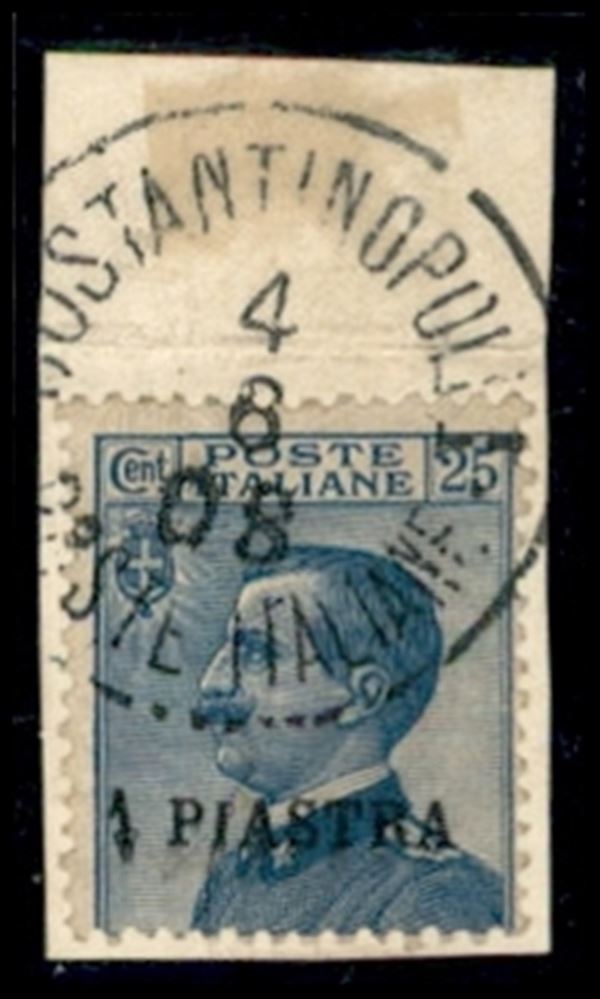 1908 - 1 piastra su 25 cent (11f) con cifra apposta a mano - usato su frammento - cert. AG