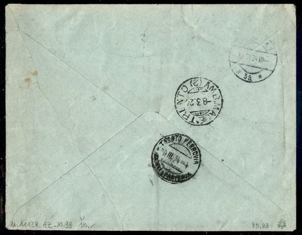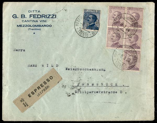 1908 - Blocco di cinque del 50 cent (85) + 25 cent (83) su raccomandata espresso da Mezzolombardo a Insbruck del 8.3.24 - ex coll. Provera