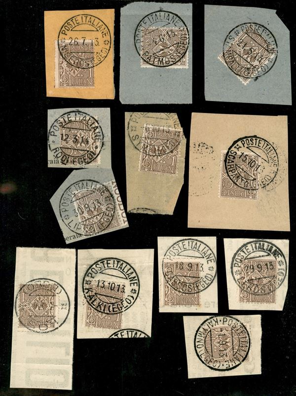 1913/1914 - dodici frammenti affrancati con 1 cent Floreale (68 Regno) annullati nelle diverse isole (manca Piscopi)
