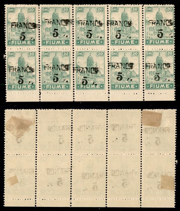 1919 - Franco 5 su 20 cent (C75 - varietà) - blocco di 10 con soprastampe disallineate e spostate - gomma origianle (blocco centrale di 6 gomma integra)