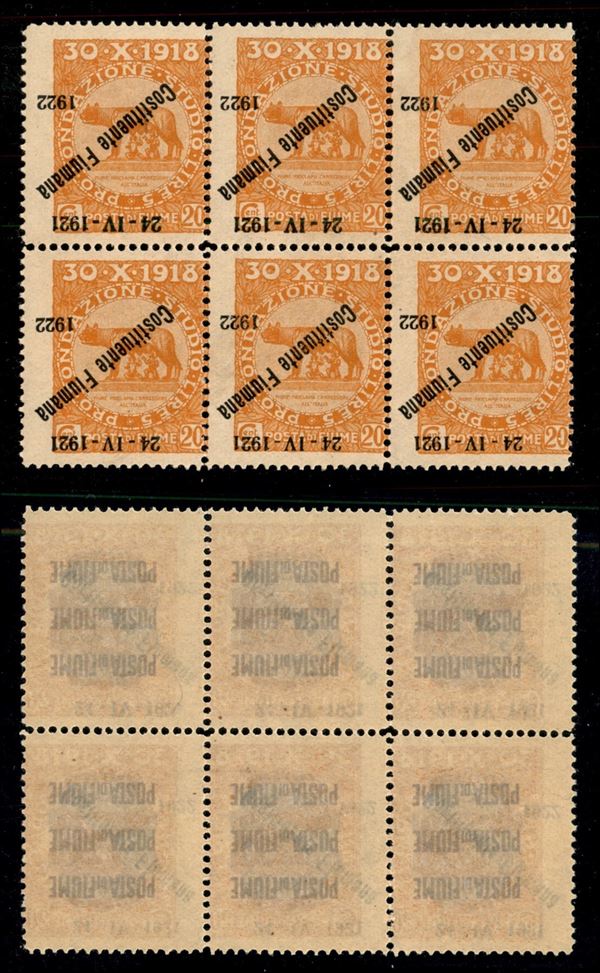 1922 - 20 cent Costituente (182 b varietà) - blocco di 6 con soprastampe capovolte e spostate - gomma integra (con falle naturali) - non catalogato
