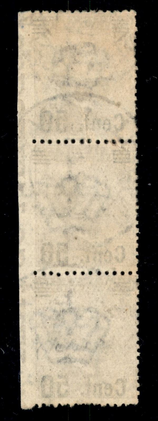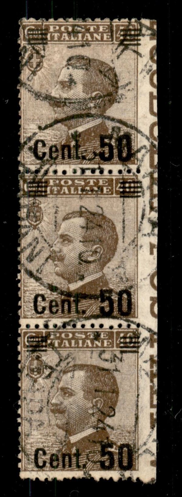 1923/27 - Michetti 50 cent su 40 striscia verticale di tre non dentellati a destra con bordo foglio (139w) usata