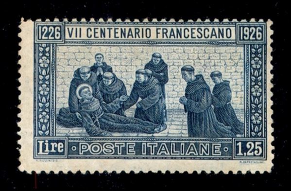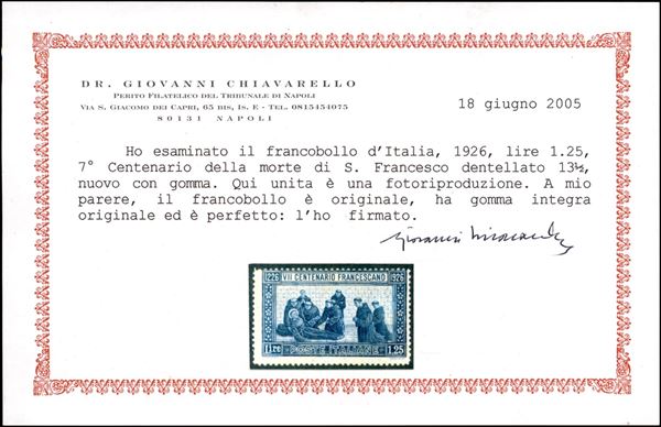1926 - 1,25 lire S.Francesco (196 - dentellato 13) - gomma integra con lievi ingiallimenti - da esaminare - Fiecchi + Raybaudi + cert. Chiavarello