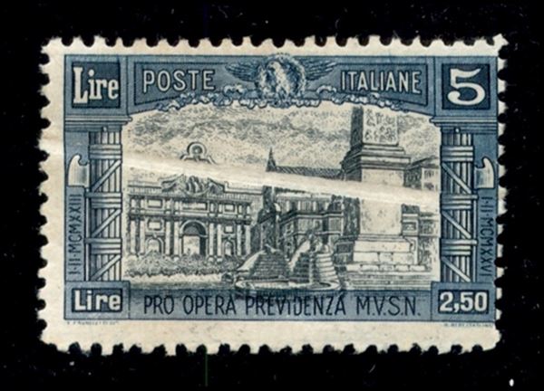 1926 - 5 lire + 2,50 lire Milizia (209 - varietà) - piega diagonale di carta successiva alla stampa della cornice - gomma integra - 5 pezzi nella tiratura