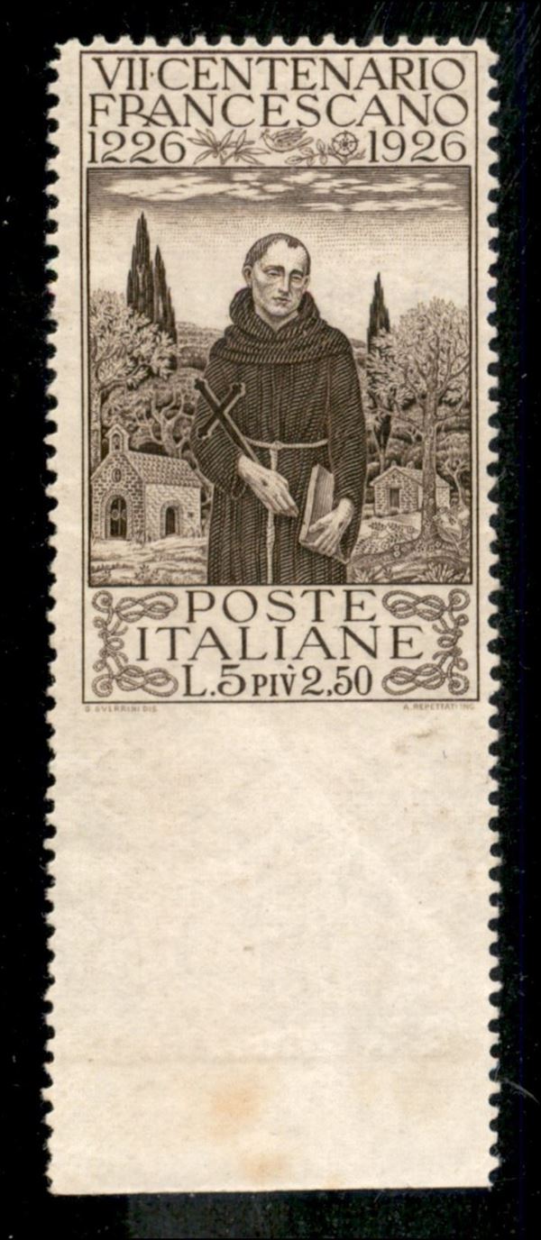 1926 - San Francesco 5 lire + 2,50 non dentellato in basso (197e) - gomma integra