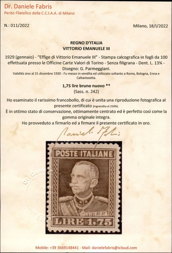 1929 - Bellissimo esemplare del 1,75 lire bruno (242) dentellato 13 3/4 - gomma originale e integra - molto ben centrato - rarissimo - Diena + cert. Colla + cert. Fabris