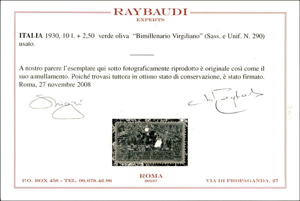 1930 - 10 lire + 2,50 lire Bimillenario Virgiliano (290) - usato - molto bello - cert. Raybaudi