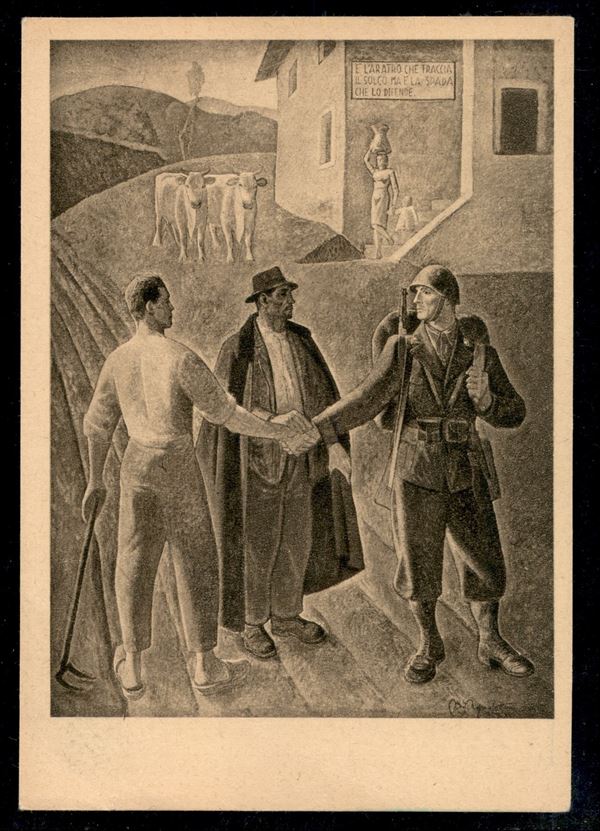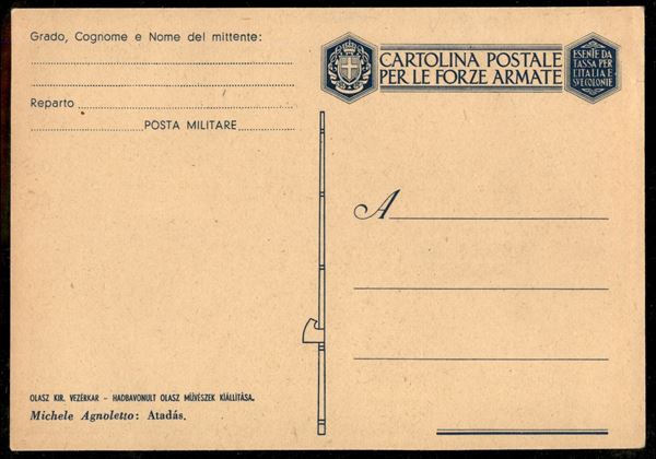 1943 - Cartolina in franchigia dell'artista Agnoletto (F79a) con testo in ungherese - serie Artisti Italiani in armi - nuova in ottime condizioni