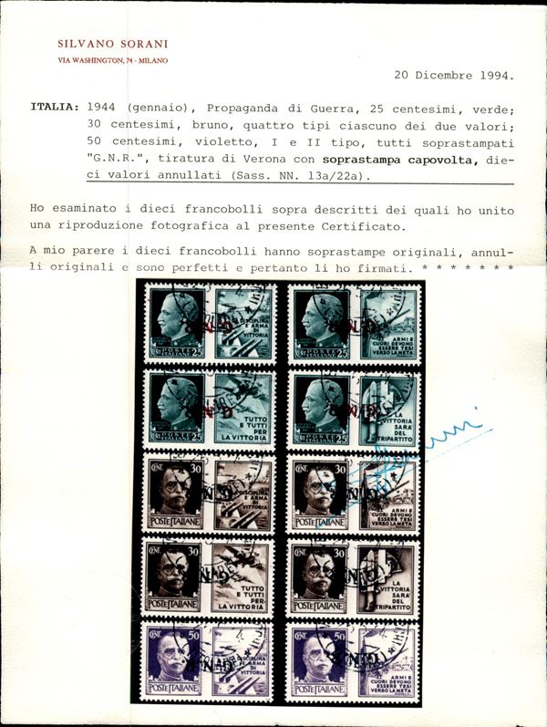 1944 - Propaganda (13a/22a) - soprastampe capovolte - serie completa - usata - Cert. Sorani + Cert. AG