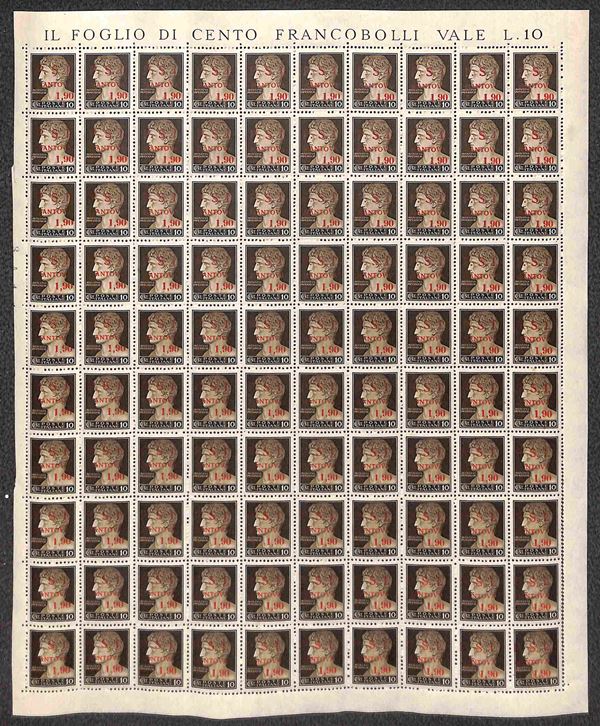 1945 - 10 cent + 1,90 lire (1) - intero foglio di 100 con tutti gli errori e le varietà della composizione - gomma integra