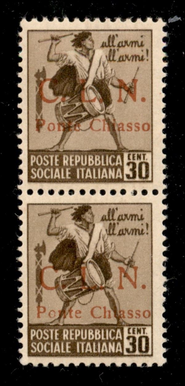 1945 - 30 cent (5 + 5bb) - coppia verticale con L punto piccolo (in basso) - gomma integra con aderenze