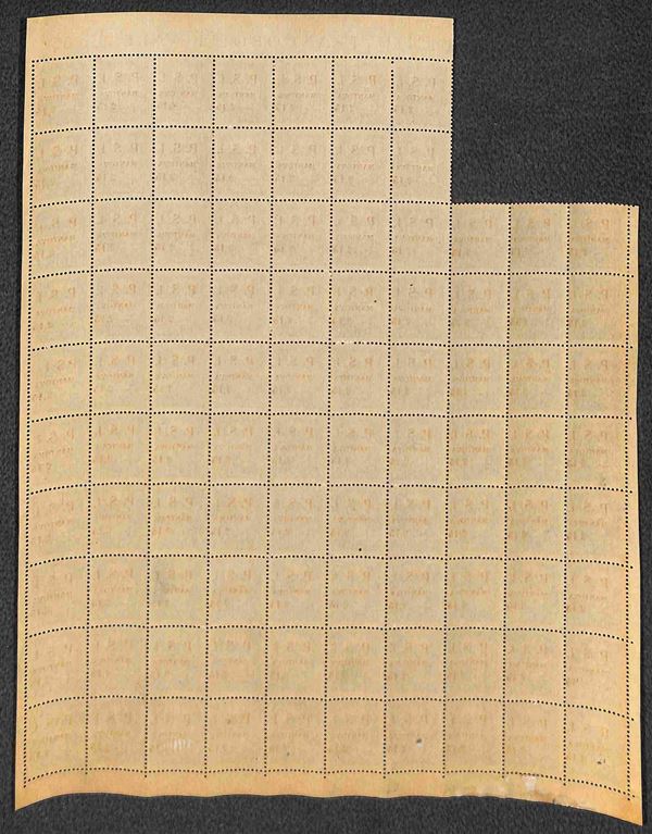1945 - Blocco di 94 esemplari del 35 cent + 2,15 lire P.S.I. (3fa) con soprastampa spostata a destra - errori di composizione pos. 83 - gomma integra