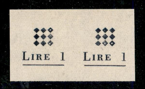1945 - Prova di Macchina della soprastampa (1 + 1 varietà) - coppia con decalco a sinistra - sempre senza gomma - cert. Raybaudi