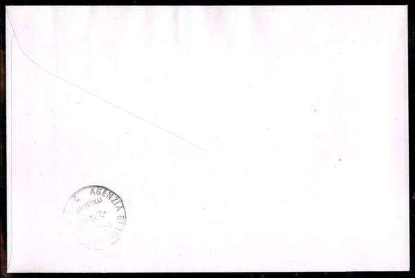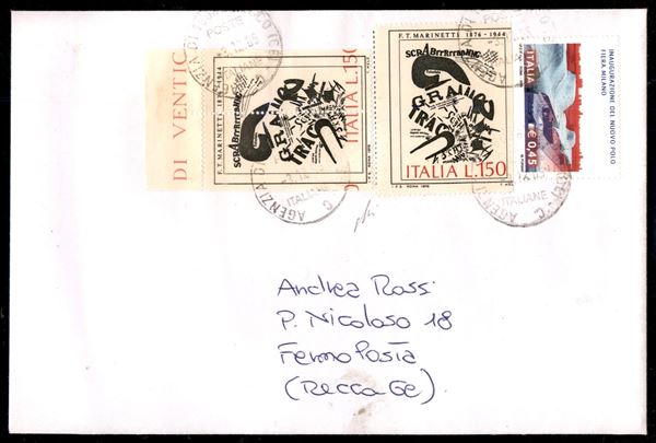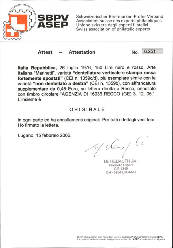 1976 - Due 150 lire Arte Italiana (1338) su busta con complementare (2814) - uno con dentellatura fortemente spostata (CEI 1359c/d) e uno non dentellato a destra (CEI 1359b) - Recco 3.12.05 - cert. Avi